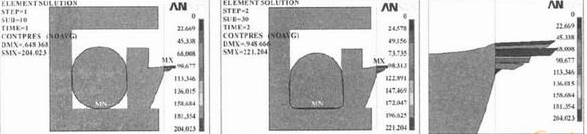 有限元模型中,橡膠單元采用超彈單元HY-PER74,缸筒、活塞桿和滑環(huán)單元采用實體單元PLANE42,用面面接觸單元TARGE169和CONTAIl72模擬了活塞桿與滑環(huán)、滑環(huán)與橡膠彈性體、橡膠彈性體和缸筒之間的接觸。模型中由剛體構成的活塞桿和缸筒的剛度是橡膠的幾萬倍,不考慮其變形,即視為O形密封圈變形時的約束邊界,為了提高計算過程的收斂性,計算中活塞桿和滑環(huán)采用的是剛柔接觸,其它采用的是柔柔接觸,滑環(huán)底部與缸筒之間的接觸對密封性能影響不大,此處并沒建立接觸,而是在滑環(huán)底部加了一約束,本模型中共建立4個接觸對。缸筒模型中網(wǎng)格劃分較橡膠圈和滑環(huán)稀疏,模型中O形圈共有7 942個節(jié)點,2 592個單元;滑環(huán)共有1 343個節(jié)點,1 259個單元;缸筒共有280個節(jié)點,220個單元。約束施加是把活塞桿的X方向施加一個位移,視為壓縮量,把缸筒完全約束,在此過程中缸筒沒發(fā)生任何變形,相當于剛體。求解時按照兩個載荷步進行求解,由缸筒施加的作為壓縮量的X方向位移定義為第一個載荷步,施加在未與密封槽接觸一側的用來模擬密封圈受到的外加液體壓力定義為第二個載荷步。