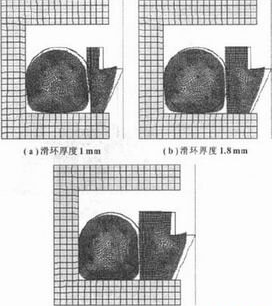 滑環(huán)式組合密封圈中滑環(huán)厚度是該技術的關鍵。從圖8中可看出滑環(huán)太薄對沖擊載荷敏感,變形比較大,容易破壞,導致泄漏,而且對系統(tǒng)清潔度要求較高,給加工、裝配、運輸、保管等帶來了困難,不利于規(guī)模生產(chǎn)。表2為滑環(huán)厚度對接觸應力的影響,從表中可看出此種結構的密封圈滑環(huán)越厚接觸應力越大,抵御變形能力較強,薄滑環(huán)靠橡膠圈變形產(chǎn)生的力施加在滑環(huán)上時,由于滑環(huán)太薄抵御變形能力弱,一部分用于滑環(huán)自身產(chǎn)生變形,因此傳遞到密封面處的接觸應力較小,但滑環(huán)太厚則剛性大,滑環(huán)由于磨損時其“跟隨補償性”差,難以在壓力作用下產(chǎn)生足夠的變形以彌補被密封表面的細微波谷,因此產(chǎn)生泄漏,達不到密封的日的,因此在設計時應根據(jù)不同密封件結構合理設計滑環(huán)厚度以保證既有良好的密封性能又有很長的使用壽命。根據(jù)計算此種結構的密封件滑環(huán)厚度應不小于2 mm。